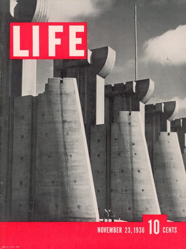 (Left) The first LIFE magazine cover, published November 23, 1936. Featuring Ft. Peck Dam in Montana. (Right) Ladle B, Otis Steel Mill, Cleveland.