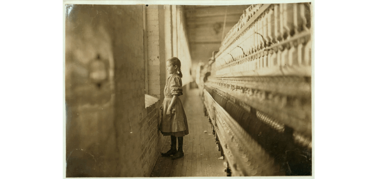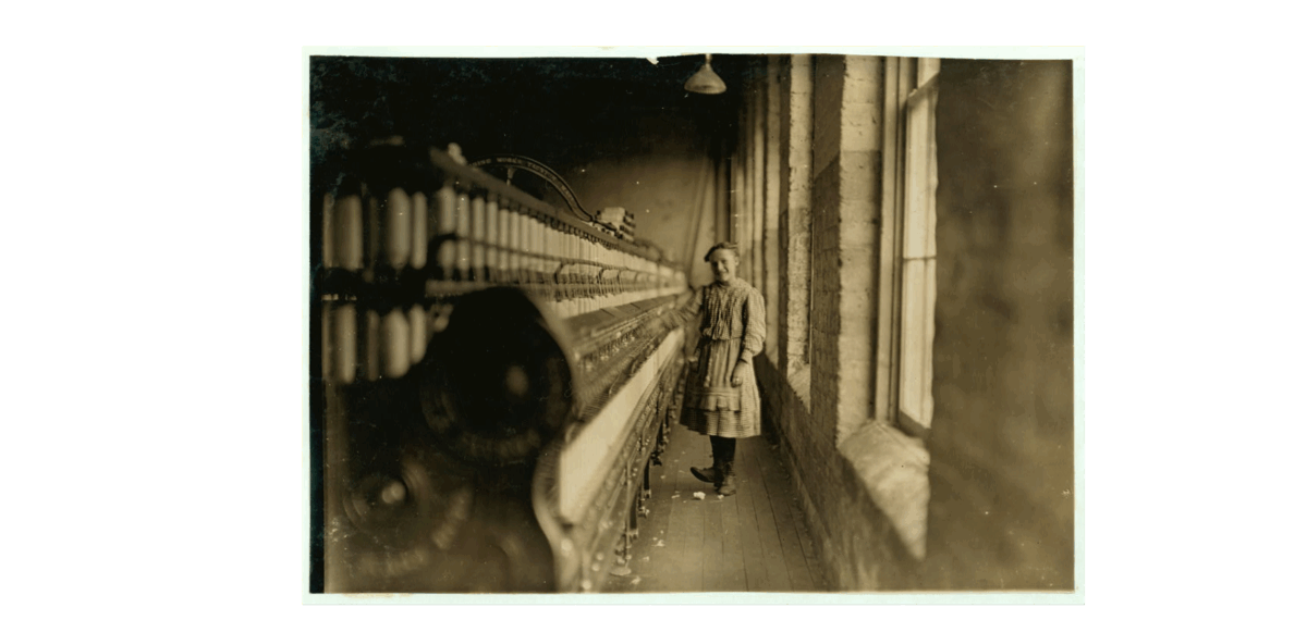 1900-1930: Lewis Wickes Hine. I came to Hine through his photos of children working in the mills in North Carolina as part of his work with The National Child Labor Committee. He has a dramatic set of vanishing horizontal lines between the rows of equipment and the windows between which stand these small girls, not at work but standing bolt upright, happy, it seems, even proud, to be photographed at these dangerous and demanding jobs.