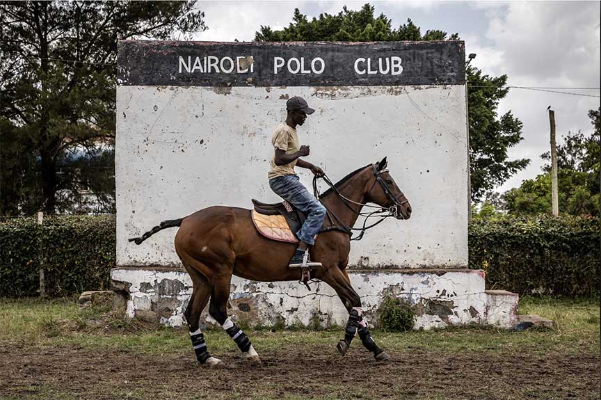 (Left) 2024 Nairobi Polo Club. (Right) 2021 – Henry Lenayasa, chief of the settlement of Archers Post, in Samburu County, Kenya, tries to scare away a massive swarm of locusts ravaging grazing area on 24 April.