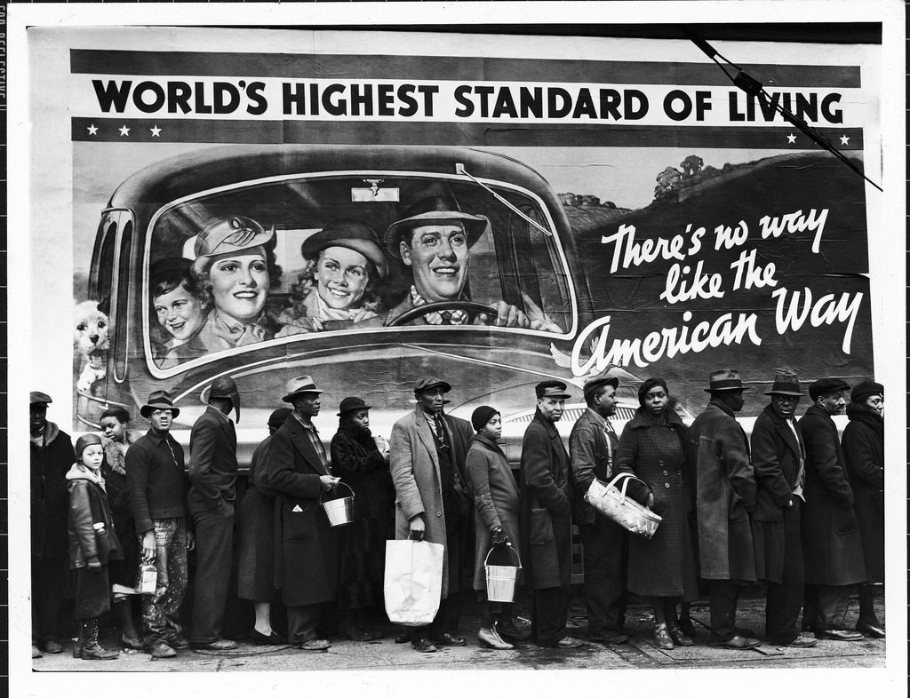 African American flood victims lined up to get food and clothing from a Red Cross relief station.