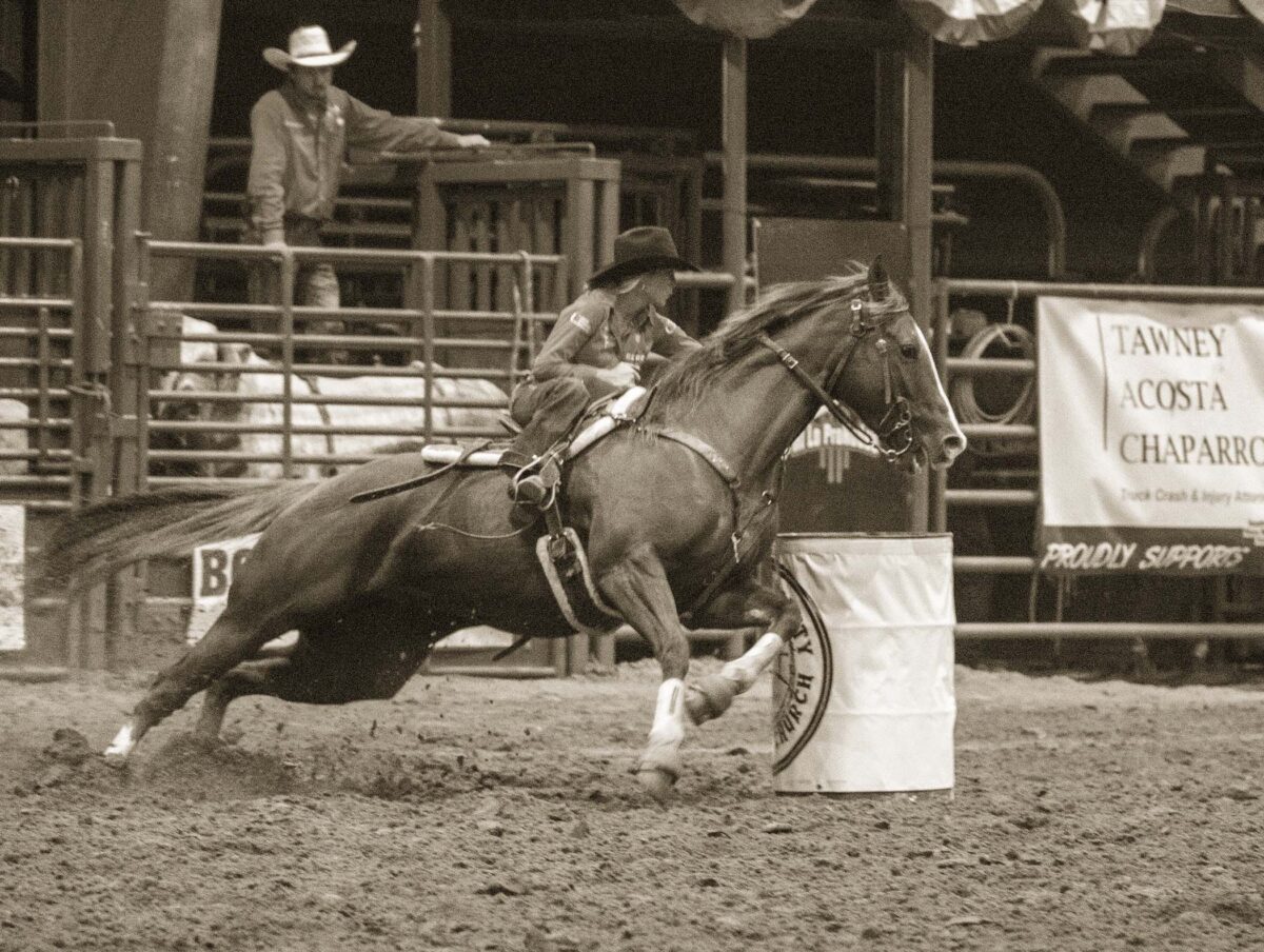 Fallon Forbes of O’Donnell, Texas, makes a turn in her barrel race run.