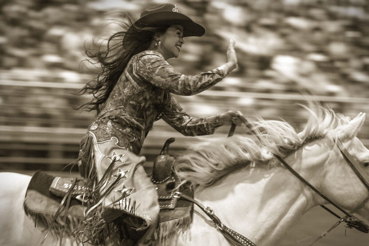 Tonantzín Candelaria, 2025 Miss Turquoise Circuit at full gallop around the packed arena.